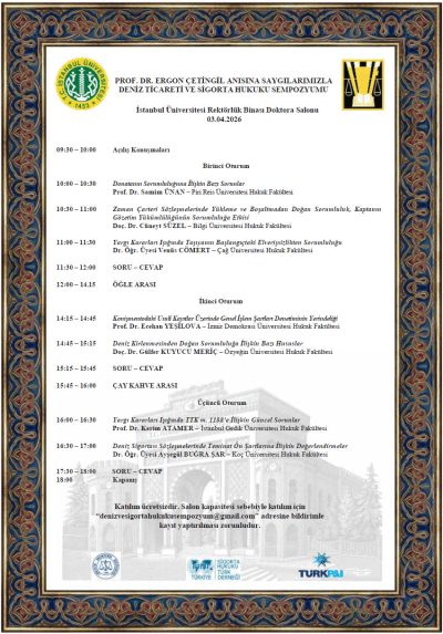 İstanbul Üniversitesi Hukuk Fakültesi tarafından Deniz Hukuku Derneği ve Sigorta Hukuku Türk Derneği ile birlikte Türk P ve I Sigorta A. Ş. desteği ile düzenlenen sempozyum 03.04.2026 günü İstanbul Üniversitesi Rektörlük Binası Doktora Salonunda gerçekleştirilecektir. Sempozyuma katılımınızı diler, saygılarımızı sunarız.