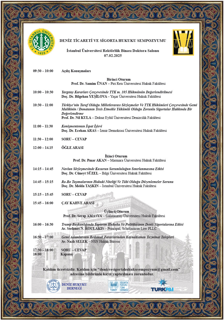 İstanbul Üniversitesi Hukuk Fakültesi tarafından Deniz Hukuku Derneği ve Sigorta Hukuku Türk Derneği ile birlikte Türk P ve I Sigorta A. Ş. desteği ile düzenlenen sempozyum 03.04.2026 günü İstanbul Üniversitesi Rektörlük Binası Doktora Salonunda gerçekleştirilecektir. Sempozyuma katılımınızı diler, saygılarımızı sunarız.